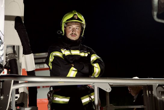 Danach erhielten die Mitglieder der FF Schwaming die Möglichkeit, selbst im Arbeitskorb der TMB Platz zu nehmen und einen ungewöhnlichen Blick auf Schwaming aus rund 32 Metern Höhe zu genießen.