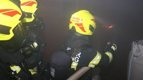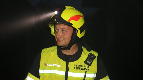 Im Außenbereich wurde eine zweite Angriffsleitung errichtet, um eine mögliche Brandausbreitung zu verhindern. Um für bessere Sichtverhältnisse zu sorgen, wurde der Hochleistungslüfter vor dem Eingang platziert.
