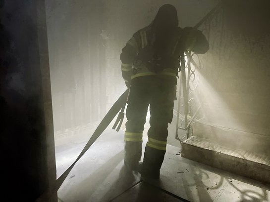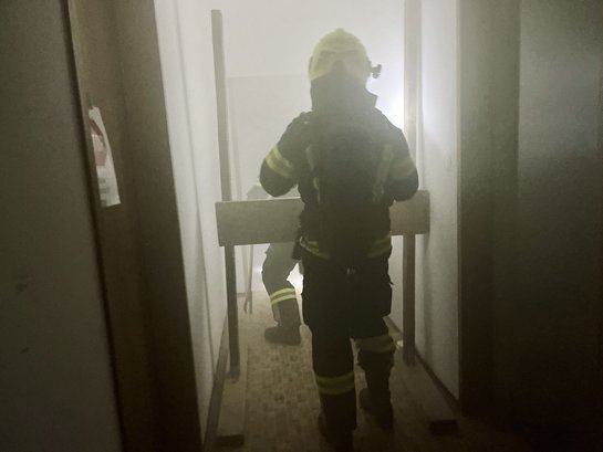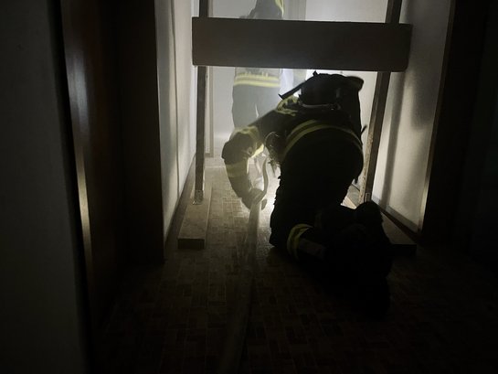 Nach dem Eintreffen am Übungsort erhielt der Einsatzleiter jedoch die Information vom Hausbesitzer, dass sich zusätzlich drei Kinder im Gebäude befinden. Zu diesem Zeitpunkt schlugen bereits Flammen aus den Fenstern im Erdgeschoss und dichter Rauch erschwerte die Sicht.