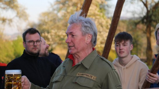 Mit einer Länge von 25 Metern wurden die Schwaminger Feuerwehrmänner und ihre fleißigen Helfer beim Aufstellen des traditionellen Maibaum durchaus gefordert. Mit sogenannten "Schwoiben" musste der Maibaum mit reiner Muskelkraft aufgestellt werden.